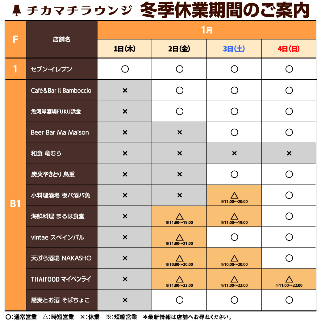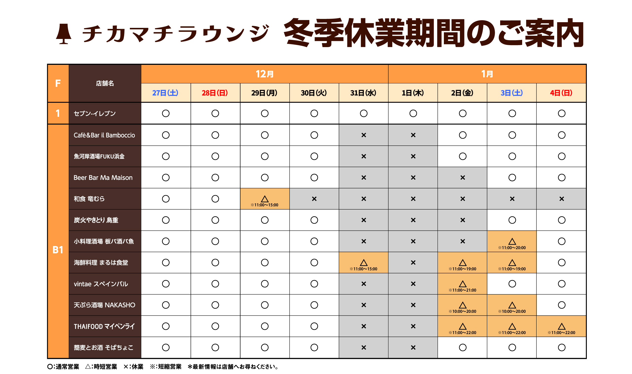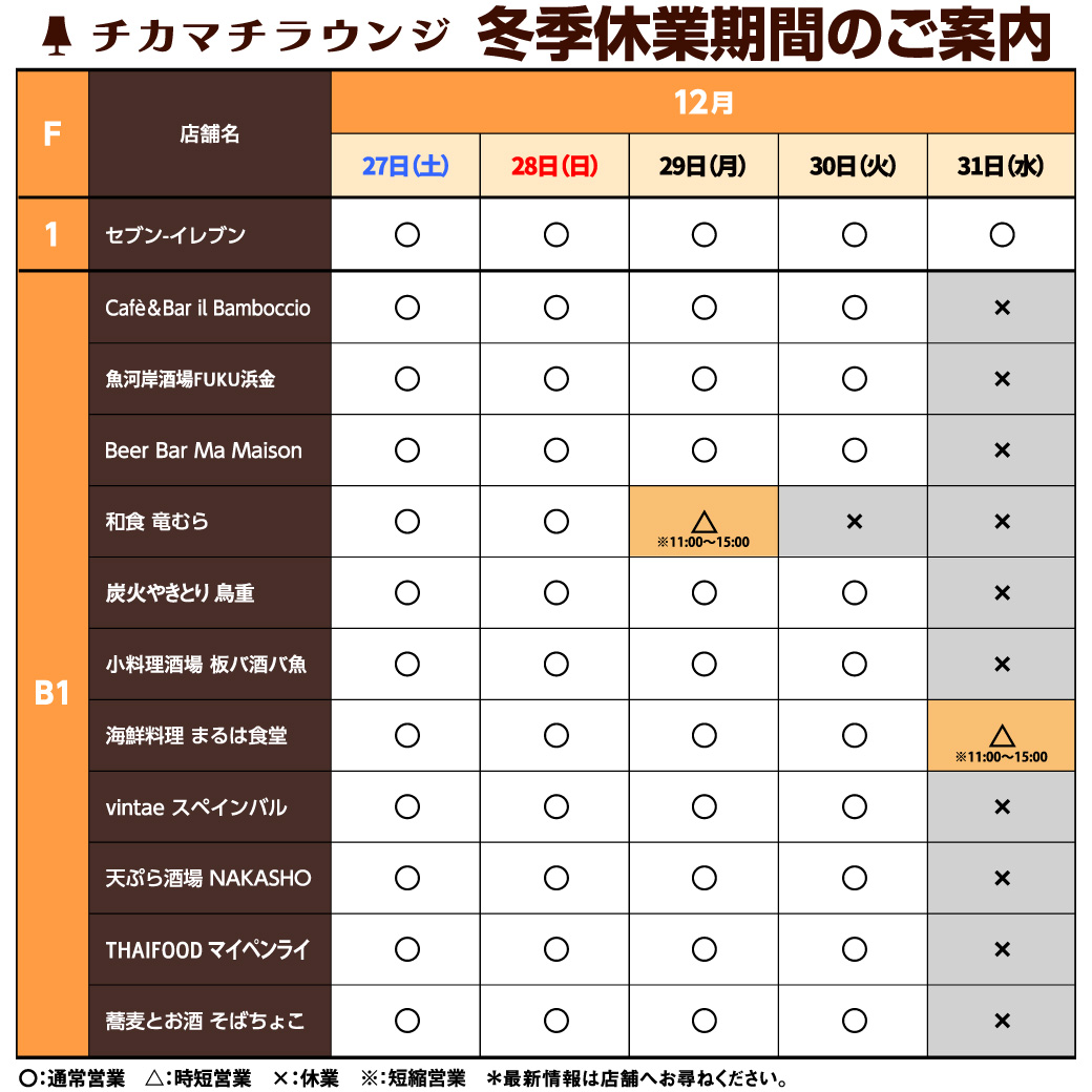 チカマチラウンジ 年末年始の営業時間と休業日のお知らせ