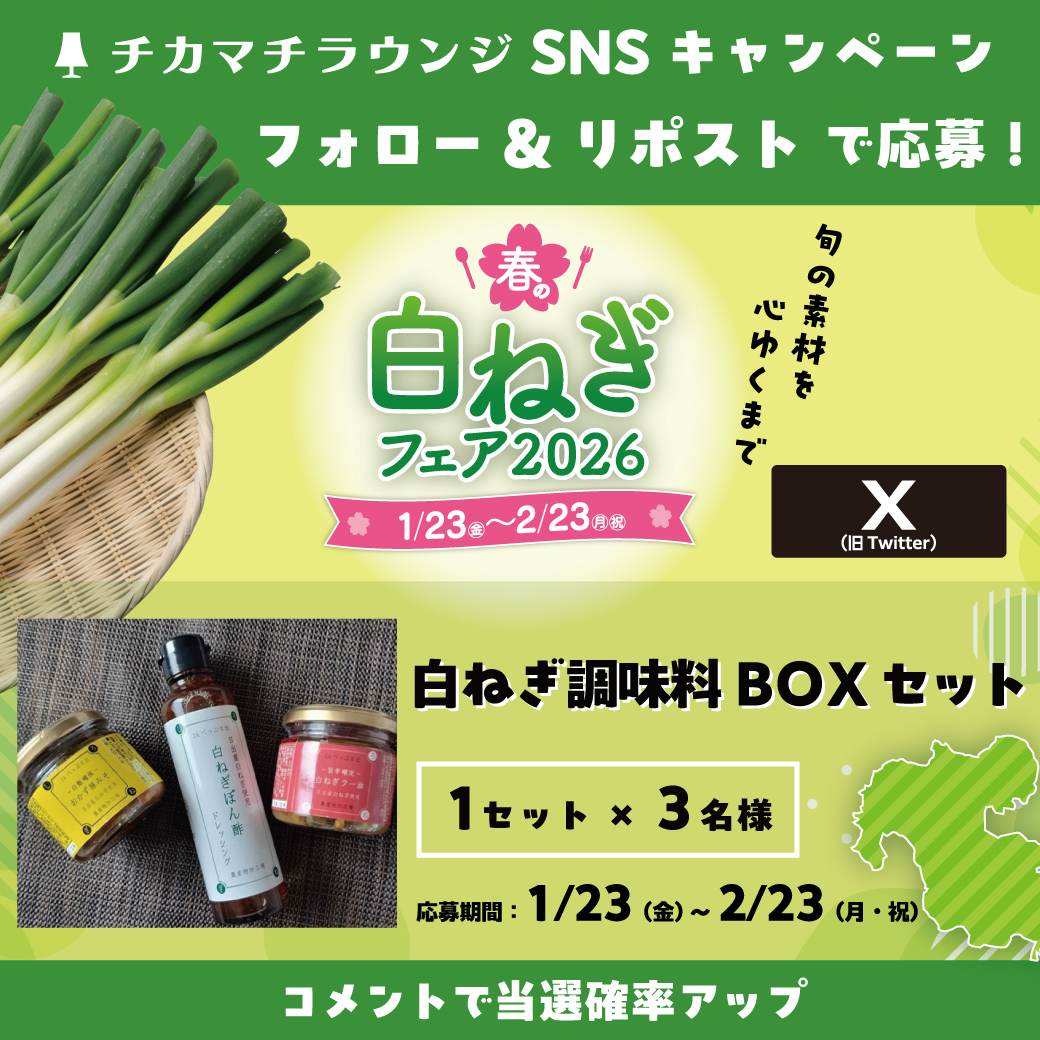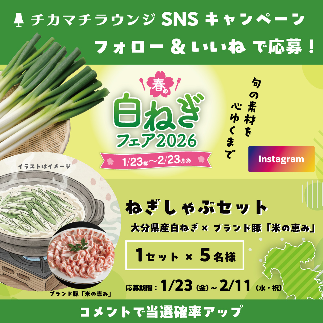 キャンペーン投稿にコメントや、チカマチラウンジでの写真を「#チカマチ春の白ねぎフェア」で投稿すると当選確率アップ!