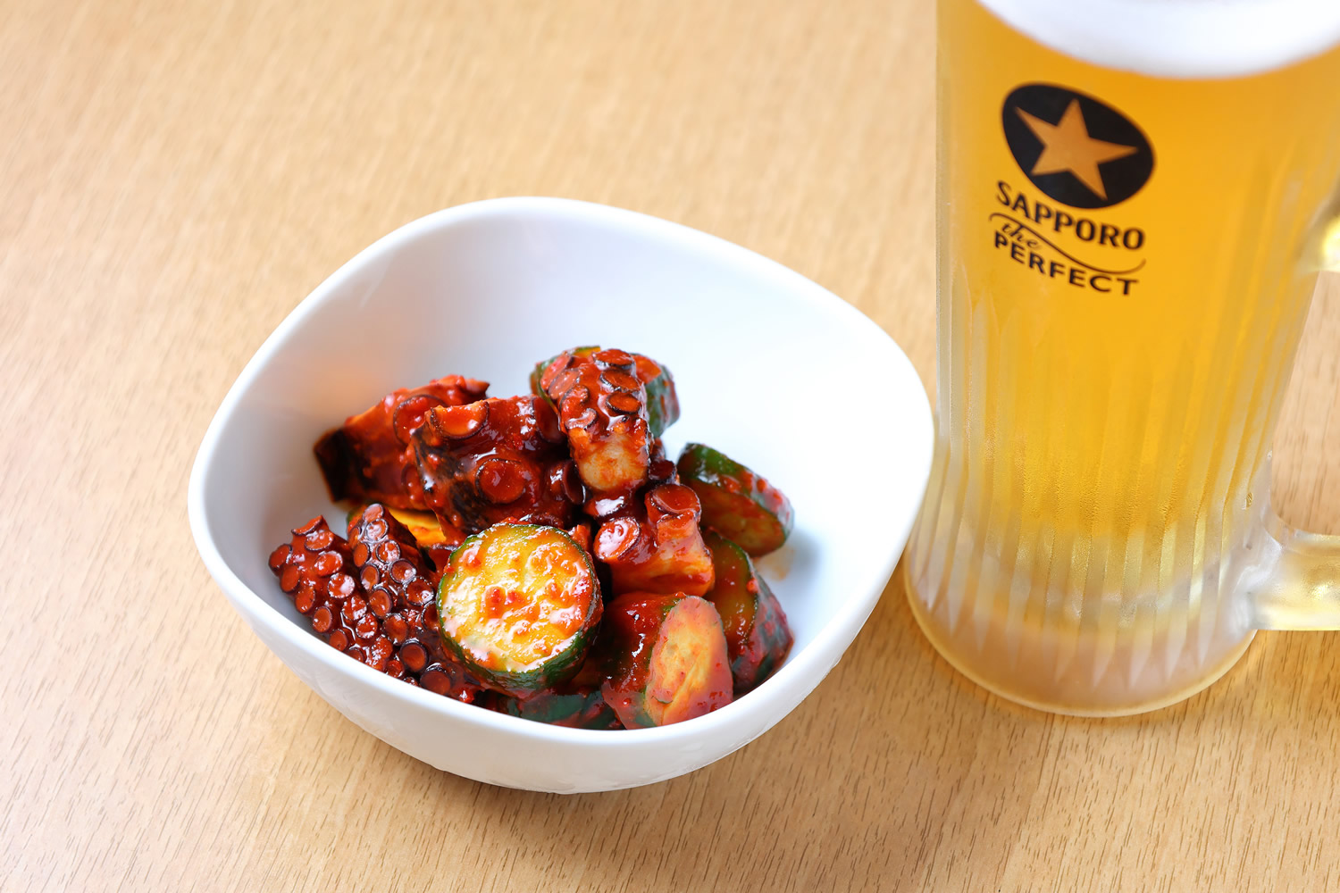 海鮮料理の名店『まるは食堂』に、韓国風の限定メニュー「たこキムチ」が登場! ぶつ切りにしたたこのコリコリとした歯ごたえは、まるで噛むほどに元気が出てくるような力強さ。そこに加わるきゅうりのシャキシャキ感と、甘辛いキムチの奥深い味わいが絶妙に絡み合い、もう口の中は小さな韓国フェス状態。